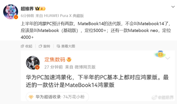 值得一提的是,数码博主“超维界”也透露了华为的鸿蒙PC布局计划。据悉,上半年华为预计推出两款鸿蒙PC新品。一款是MateBook 14的迭代版本,其将不再沿用Matebook 14的命名,而是更名为Matebook(基础版),售价预计在5000元以上;另一款则是Matebook neo,售价预计在4000元以上。